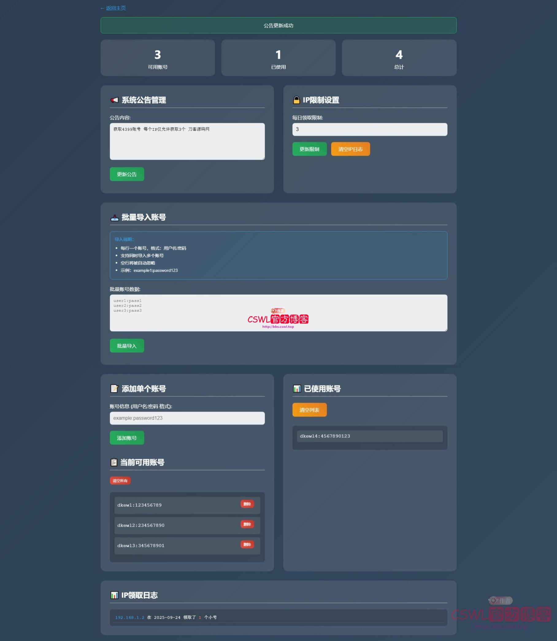 此为小号分发卡密系统源码,专用于分发小号库存账号或卡密等使用,感兴趣者可自行部署使用!